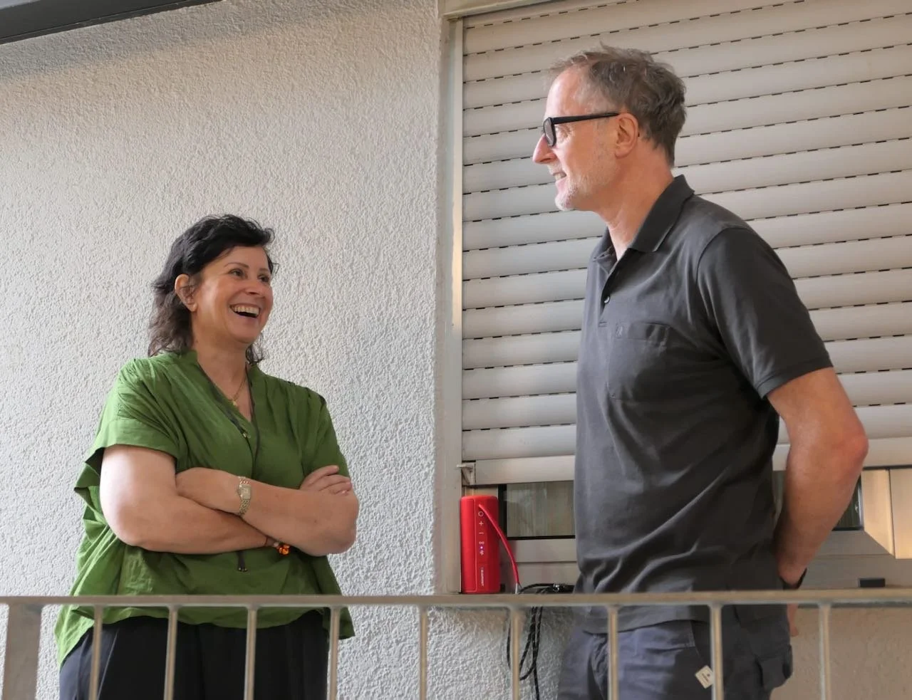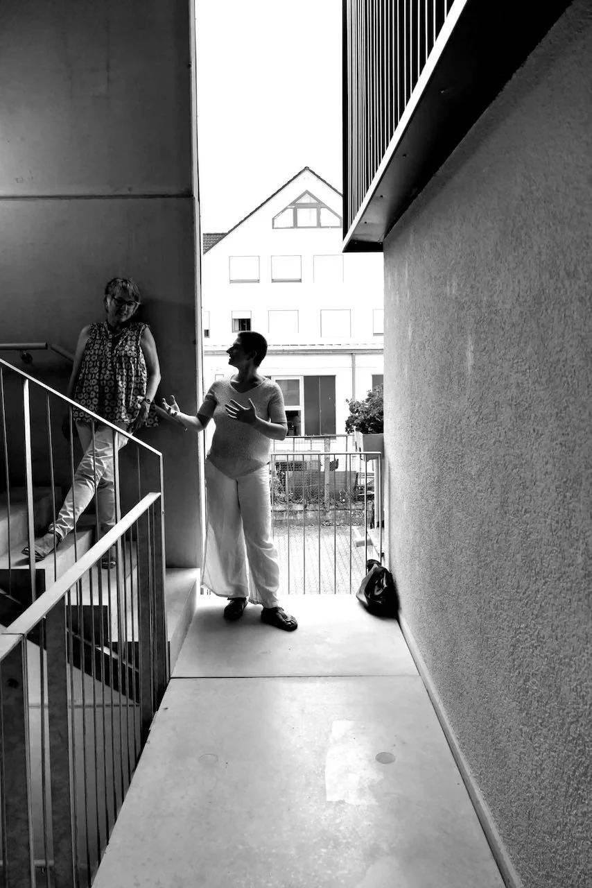 Vor einigen Jahren hat sie mit einer innovativen Architektur auf ein Flachdach aufgestockt. Dorthin führt ein modernes Außentreppenhaus. Großzügig, schlicht in der Gestaltung, und mit vielerlei Ausblicken und Durchblicken.